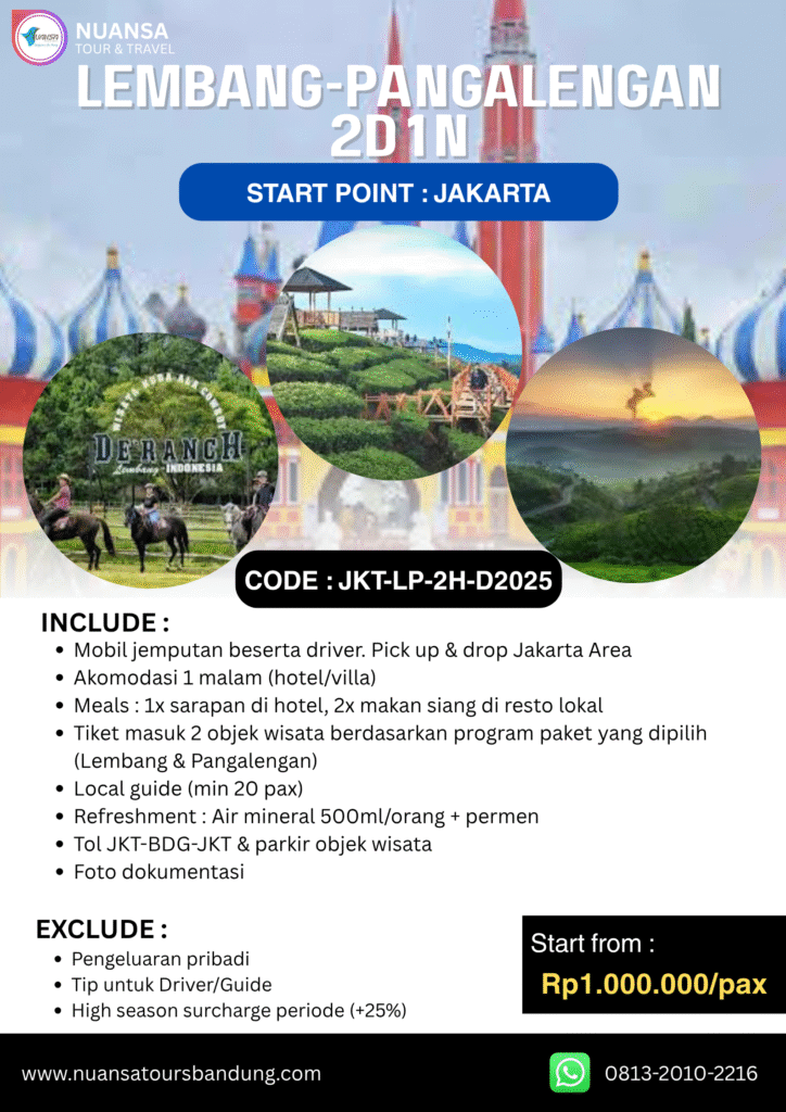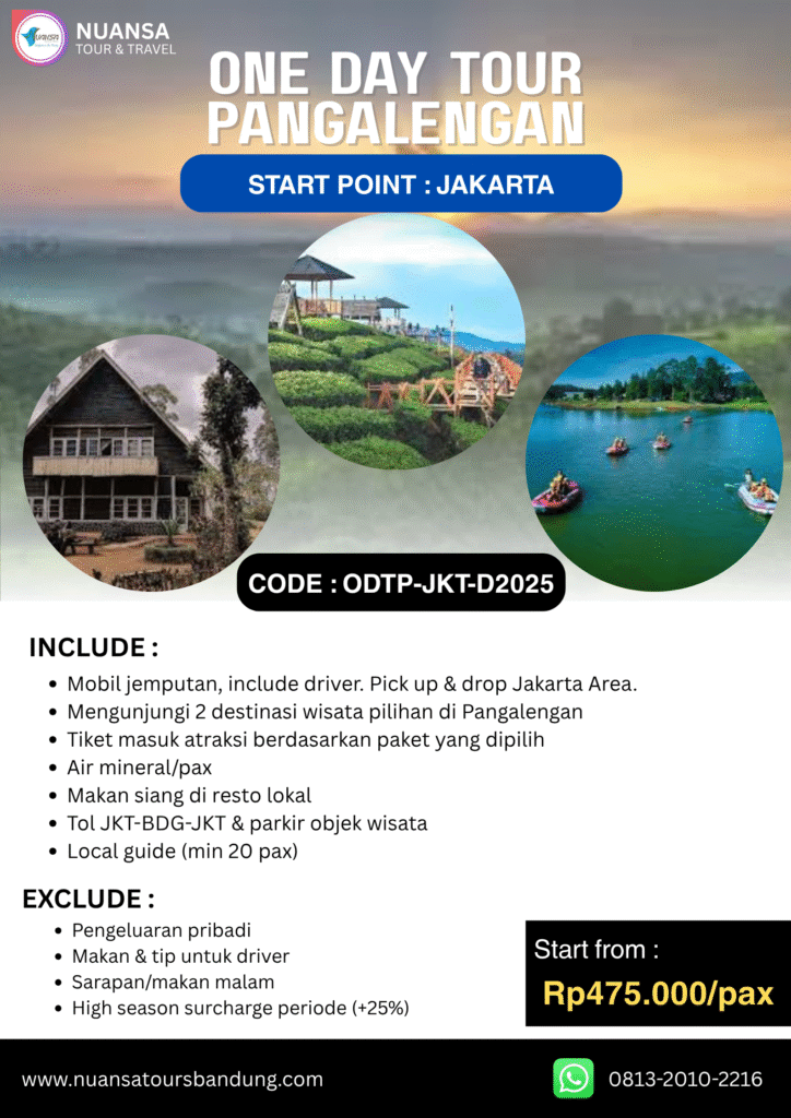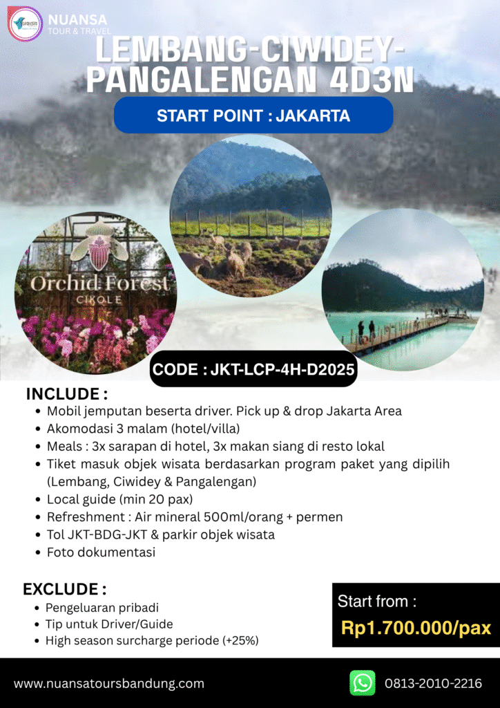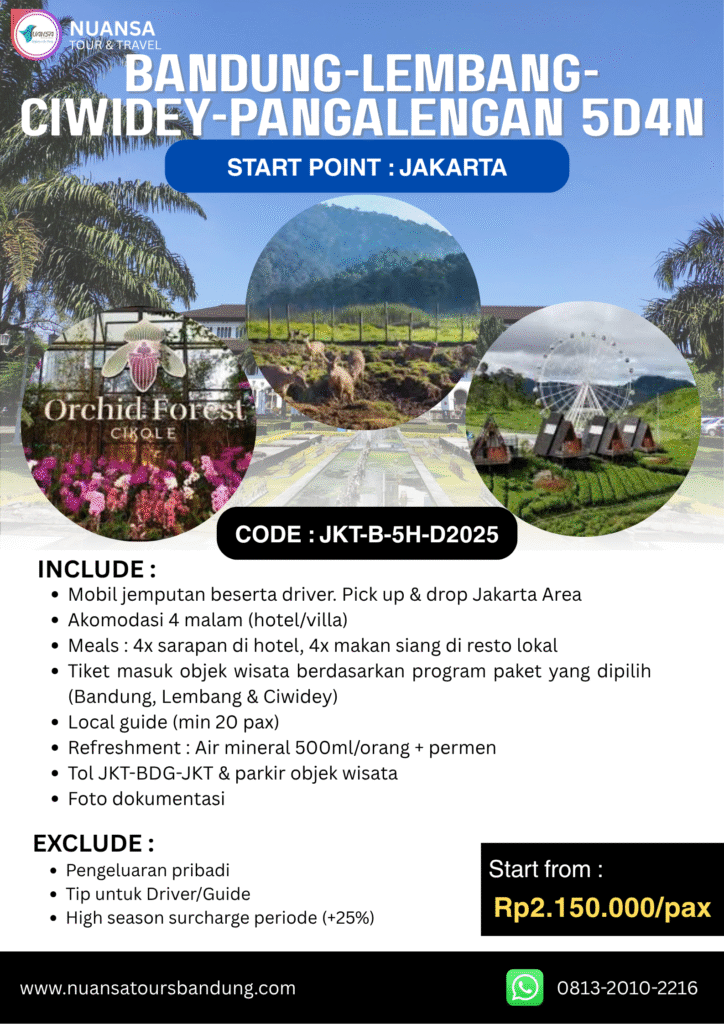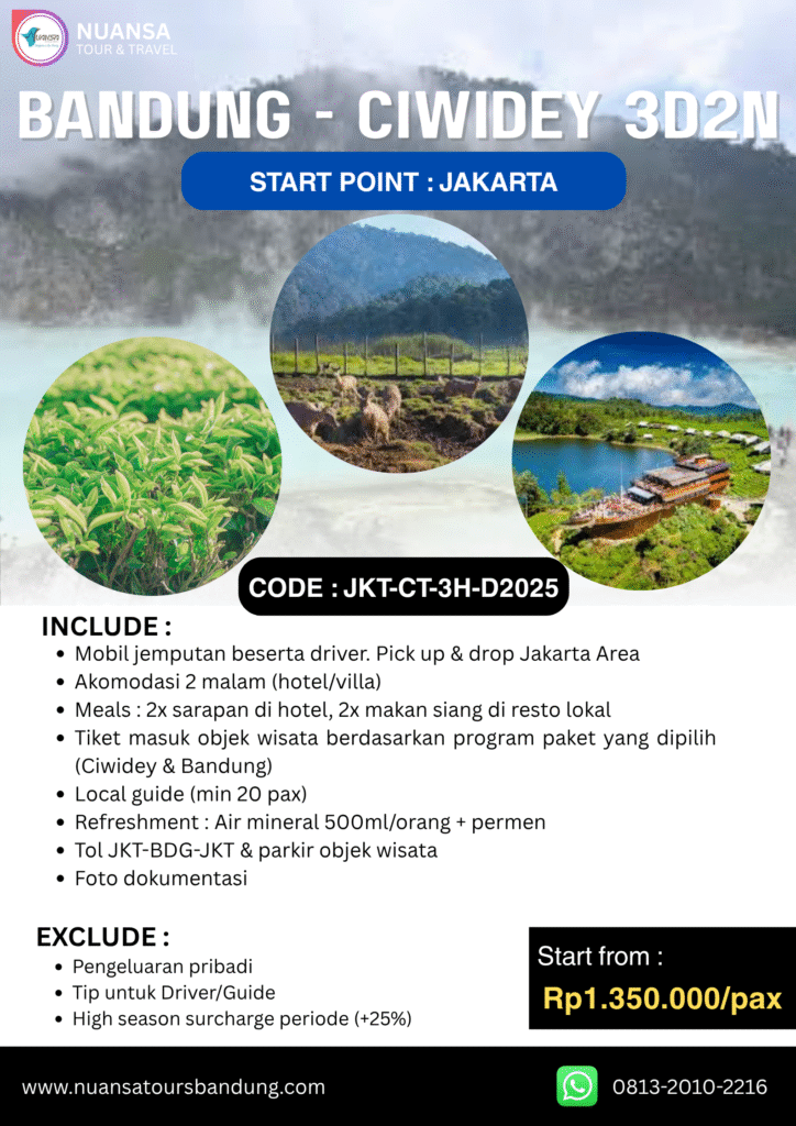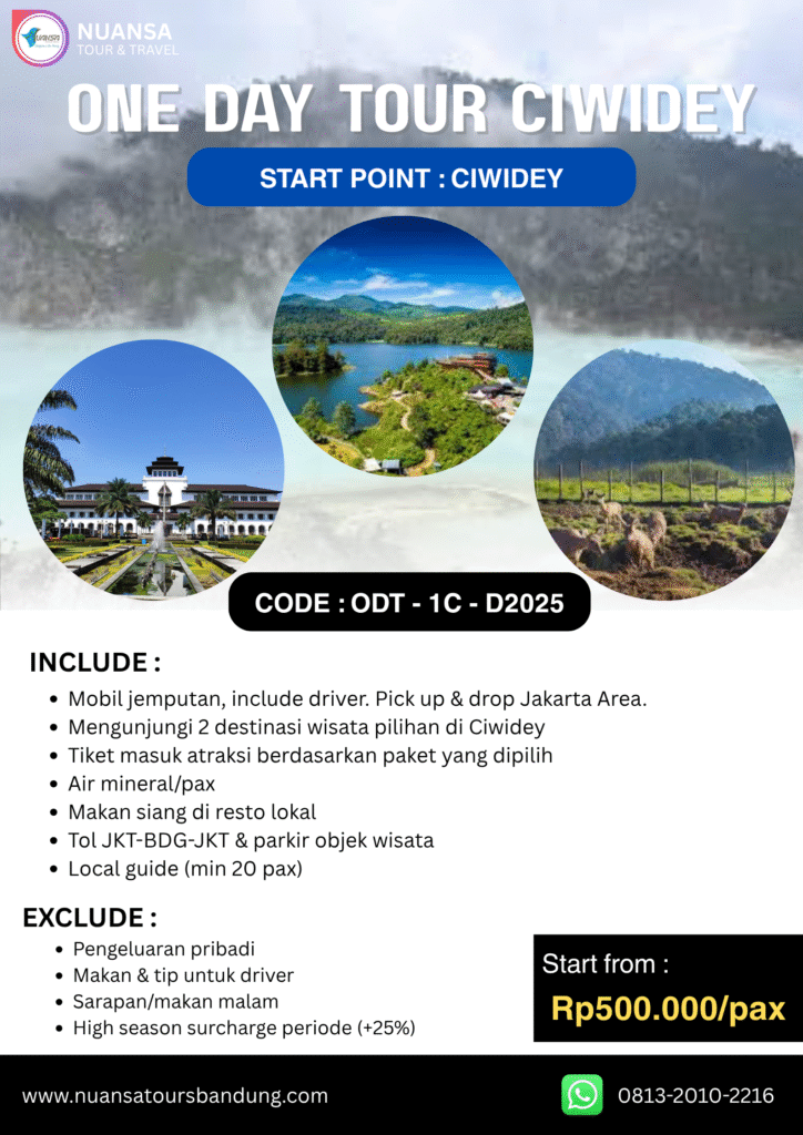 ONE DAY TOUR PACKAGE One Day Tour Ciwidey 1 Day (Full Day Tour) INFO SELENGKAPNYA One Day Tour Lembang 1 Day (Full Day Tour) INFO SELENGKAPNYA One Day Tour Pangalengan 1 Day (Full Day Tour) INFO SELENGKAPNYA 2D1N TOUR PACKAGE 2D1N Bandung-Lembang 2 Day - 1 Night INFO SELENGKAPNYA 2D1N Ciwidey-Pangalengan 2 Day - 1 Night INFO SELENGKAPNYA 2D1N Lembang-Ciwidey 2 Day - 1 Night INFO SELENGKAPNYA 2D1N Lembang-Pangalengan 2 Day - 1 Night INFO SELENGKAPNYA 2D1N Jakarta-Ciwidey 2 Day - 1 Night INFO SELENGKAPNYA 3D2N TOUR PACKAGE 3D2N Bandung-Lembang 3 Day - 2 Night INFO SELENGKAPNYA 3D2N Jakarta-Ciwidey 3 Day - 2 Night INFO SELENGKAPNYA 3D2N Ciwidey-Pangalengan 3 Day - 2 Night INFO SELENGKAPNYA 3D2N Lembang-Ciwidey 3 Day - 2 Night INFO SELENGKAPNYA 3D2N Lembang-Pangalengan 3 Day - 2 Night INFO SELENGKAPNYA 4D3N & 5D4N TOUR PACKAGE 4D3N Bandung-Lembang-Ciwidey 4 Day - 3 Night INFO SELENGKAPNYA 4D3N Lembang-Ciwidey-Pangalengan 4 Day - 3 Night INFO SELENGKAPNYA 5D3N Bandung-Lembang-Ciwidey 5 Day - 4 Night INFO SELENGKAPNYA Member of : OFFICE HOUR SENIN – JUMAT : 08.30-17.00SABTU-MINGGU : 08.30-17.0024 Hours open for reservation LOCATION Komplek Permata Biru Jalan Edelweis V Blok H2 No 5,Cinunuk, Cileunyi,Kabupaten Bandung (40624)Jawa Barat, Indonesia. FOLLOW US Instagram Tripadvisor Youtube